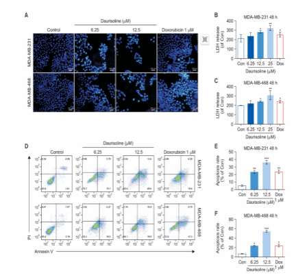 研究团队通过科学试验中心平台开展科研,实验结果发现,不同浓度蝙蝠葛苏林碱处理MDA-MB-231和MDA-MB-468细胞48h后,凋亡细胞数及凋亡小体显著增加,且活细胞数随药物浓度升高而减少;在乳酸脱氢酶(LDH)释放实验中用药组细胞培养液中LDH浓度显著高于对照组,提示细胞膜受损及晚期凋亡发生;蝙蝠葛苏林碱处理后存活细胞比例下降,早期凋亡细胞比例显著升高。结果表明,蝙蝠葛苏林碱通过诱导TNBC细胞凋亡发挥抗肿瘤作用。