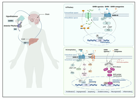 生长激素释放激素(GHRH)是一种主要由下丘脑合成的神经肽激素,通过激活垂体GHRH受体(GHRHR)刺激生长激素(GH)的释放,进而调节胰岛素样生长因子-1(IGF-1)的生成,构成经典的GHRH/GH/IGF-1轴。近年来研究发现,GHRH及其受体也在多种外周组织(如心脏、血管、肾脏、神经系统中)表达,通过旁分泌方式参与调控细胞增殖、分化、存活以及炎症与氧化应激反应。