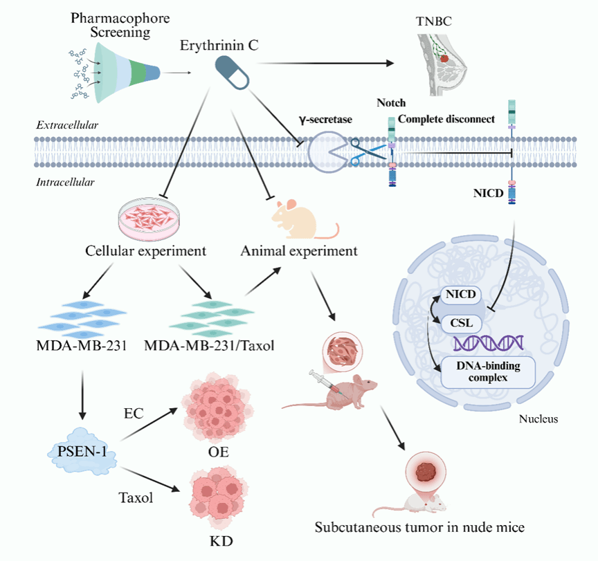 由沈阳医学院贾辉教授、周明生教授带领研究生杨可帆、姚阔等学生团队在Pythomedicine杂志在线发表的一项题为“Naturally derived Erythrinin C targets γ-secretase signaling to suppress triple-negative breast cancer progression and reverse paclitaxel resistance”的基础实验。首次发现从刺桐中分离的异黄酮类化合物Erythrinin C (EC)是天然的γ-分泌酶抑制剂,可通过靶向γ-分泌酶的PSEN-1亚基,在体内外发挥显著的抗TNBC作用,并有效逆转TNBC细胞对紫杉醇的耐药性,为TNBC的靶向治疗及耐药逆转提供了全新的候选药物。